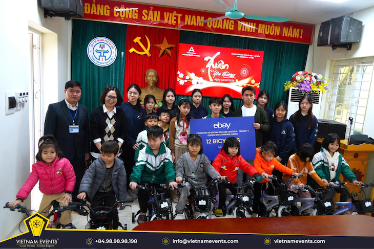 Thay mặt khách hàng eBay, VietnamEvents đã trao tặng 12 chiếc xe đạp cho các em tại Trung tâm Bảo trợ Xã hội số I, Hà Nội, giúp các em thêm tự tin trên hành trình đến trường; Đồ chơi và bánh kẹo đã được gửi tới các em nhỏ tại vùng cao Sơn La, mang theo niềm vui giản dị giữa tiết xuân se lạnh nơi núi rừng.